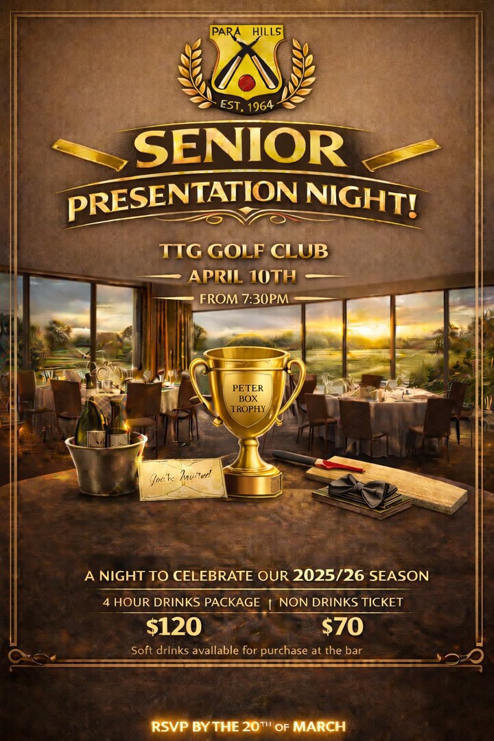 All senior players, members and supporters are warmly invited to attend the Para Hills Cricket Club Senior Presentation Dinner as we celebrate the 2025/26 season.